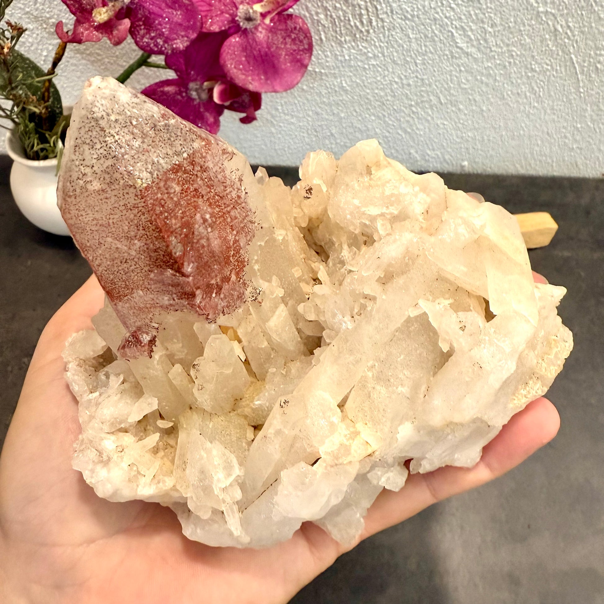 La formación en drusa potencia al máximo estas cualidades: cada punta cristalina refuerza la energía del cristal central, generando un campo que amplifica cualquier intención y multiplica la vibración positiva en el entorno. Es una pieza ideal para quienes buscan elevar la energía de su espacio, potenciar sus rituales o trabajar con programación de cristales.
