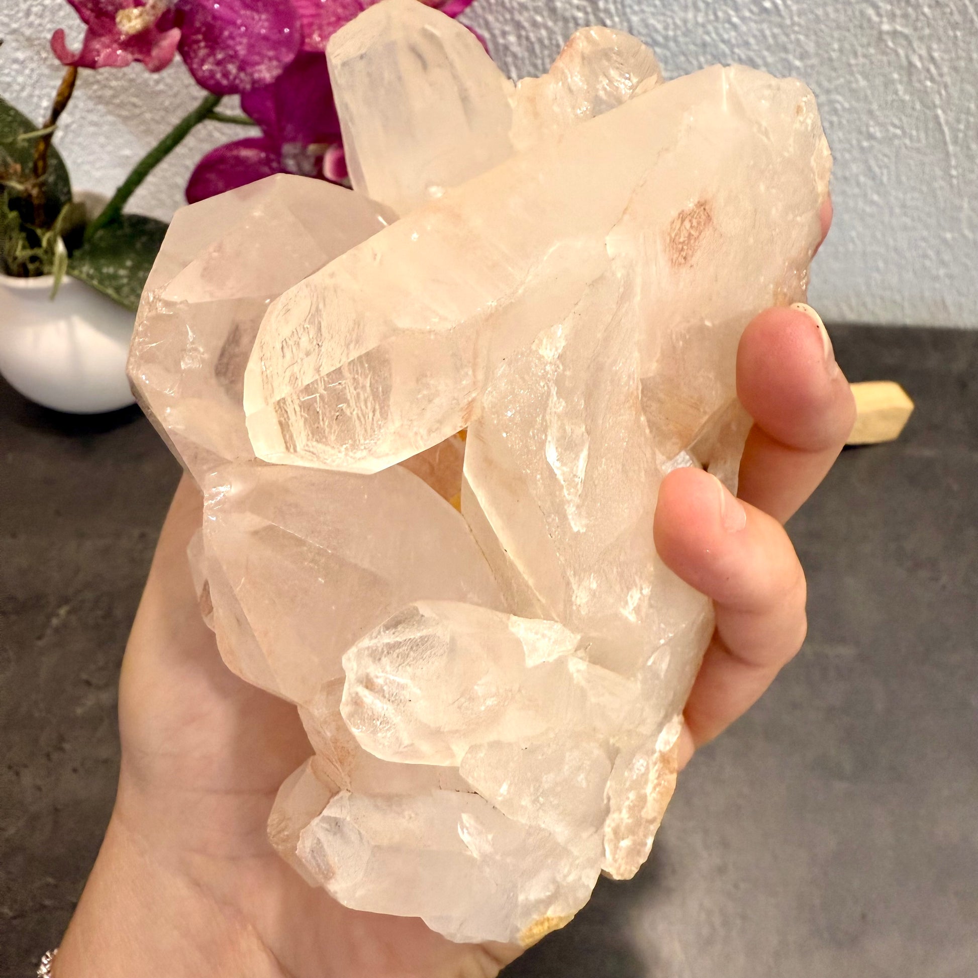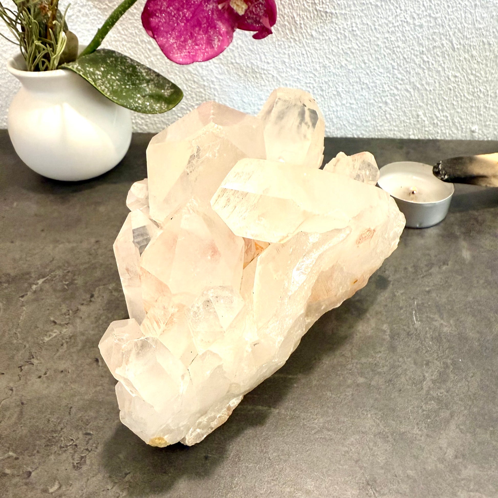 La estructura de puntas grandes amplifica cada intención de manera poderosa. No solo irradia energía en todas direcciones, sino que también actúa como multiplicador, expandiendo y elevando la frecuencia vibratoria del entorno. Además, gracias a su naturaleza programable, esta drusa puede ser cargada con una intención clara, potenciando cualquier propósito espiritual o energético que se deposite en ella.